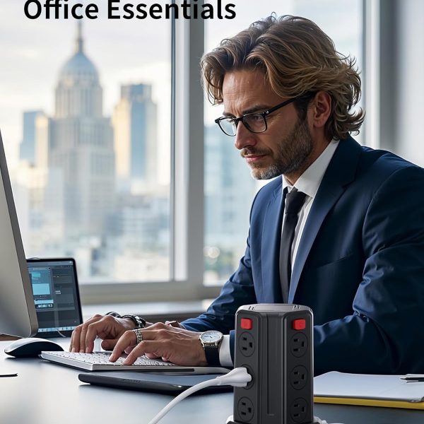 Power Strip Surge Protector, 10 Ft Extension Cord with 12 AC Multiple Outlets 4 USB (1 USB C), SMALLRT Power Tower Desktop Charging Station (Black, 6.5 FT)